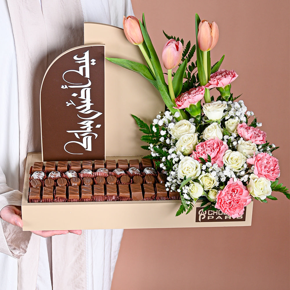 Make your Eid celebrations unforgettable with the Eid Special Chocolate & Flowers Stand from Chocola Paris. This luxurious arrangement combines the finest artisanal chocolates with a stunning display of fresh, hand-selected flowers—elegantly presented to capture the beauty and warmth of the occasion.