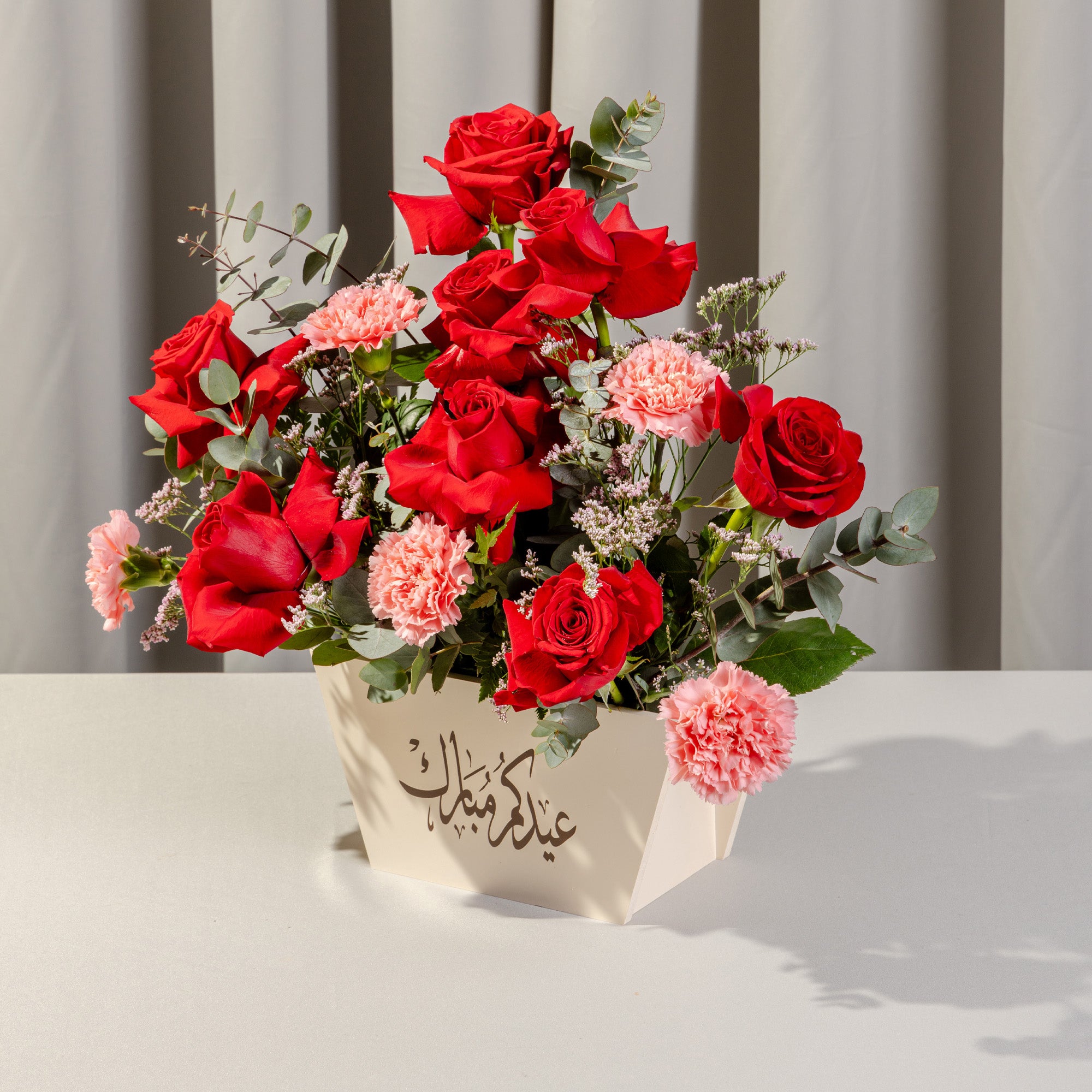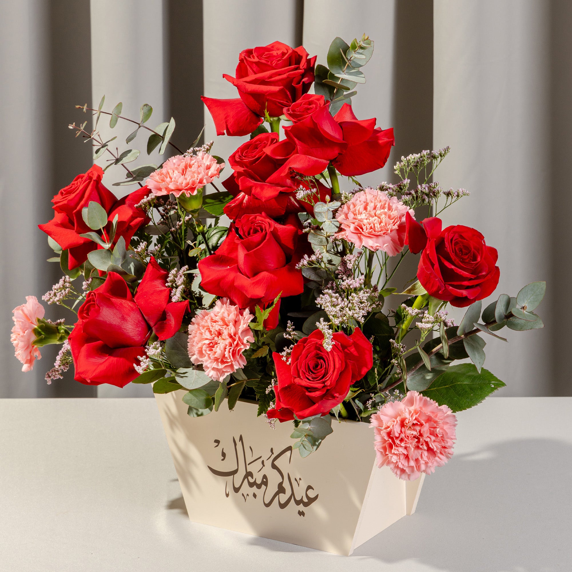 Brighten any occasion with our Radiance Floral Gift Box, featuring an elegant arrangement of fresh red roses, pink carnations, delicate limonium, and eucalyptus. Thoughtfully arranged in a charming wooden box, this exquisite floral gift adds warmth and sophistication to any space. Perfect for gifting, home décor, or surprising a loved one. Order now for flower delivery in Qatar!